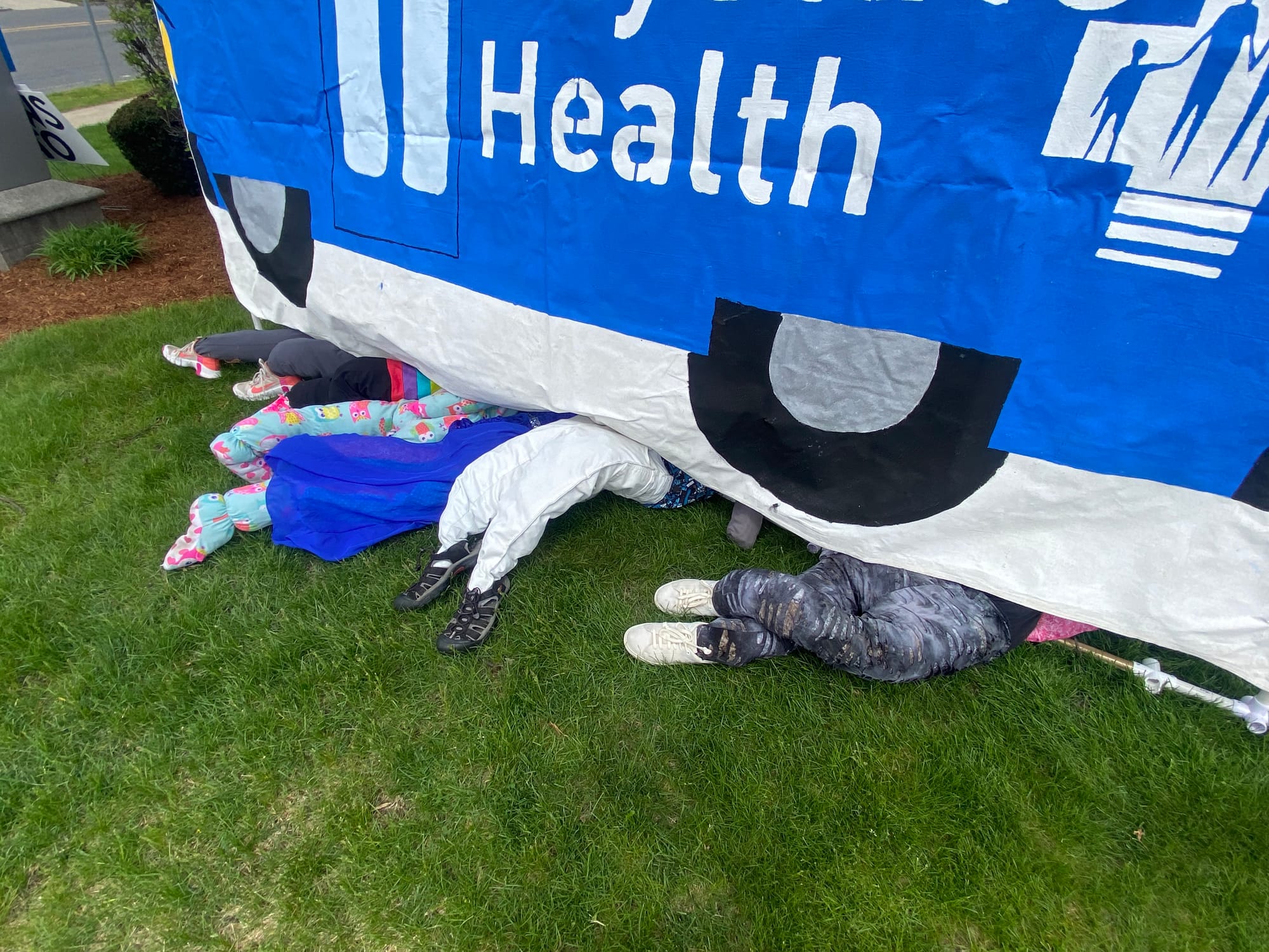 The protest art installation on site Saturday featured a bright blue bus marked with the Baystate name and logo on a white canvas metaphorically running over several sets of stuffed clothes meant to represent trans kids along with several signs which together said "Baystate throws trans kids under the bus".